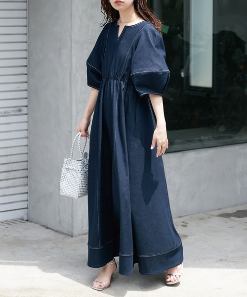 - natural couture/ナチュラルクチュール/お家で洗える/ランタンスリーブワンピース/デニムワンピース/Aライン/ベルト付属/ボリューム袖