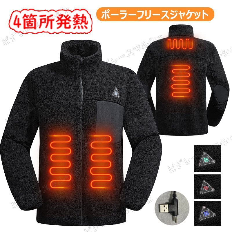 - 電熱ポーラーフリースジャケット 加熱コート 4箇所発熱 5秒速暖 USB給電 急速発熱 3段階調温 ブラック Lサイズ 1168