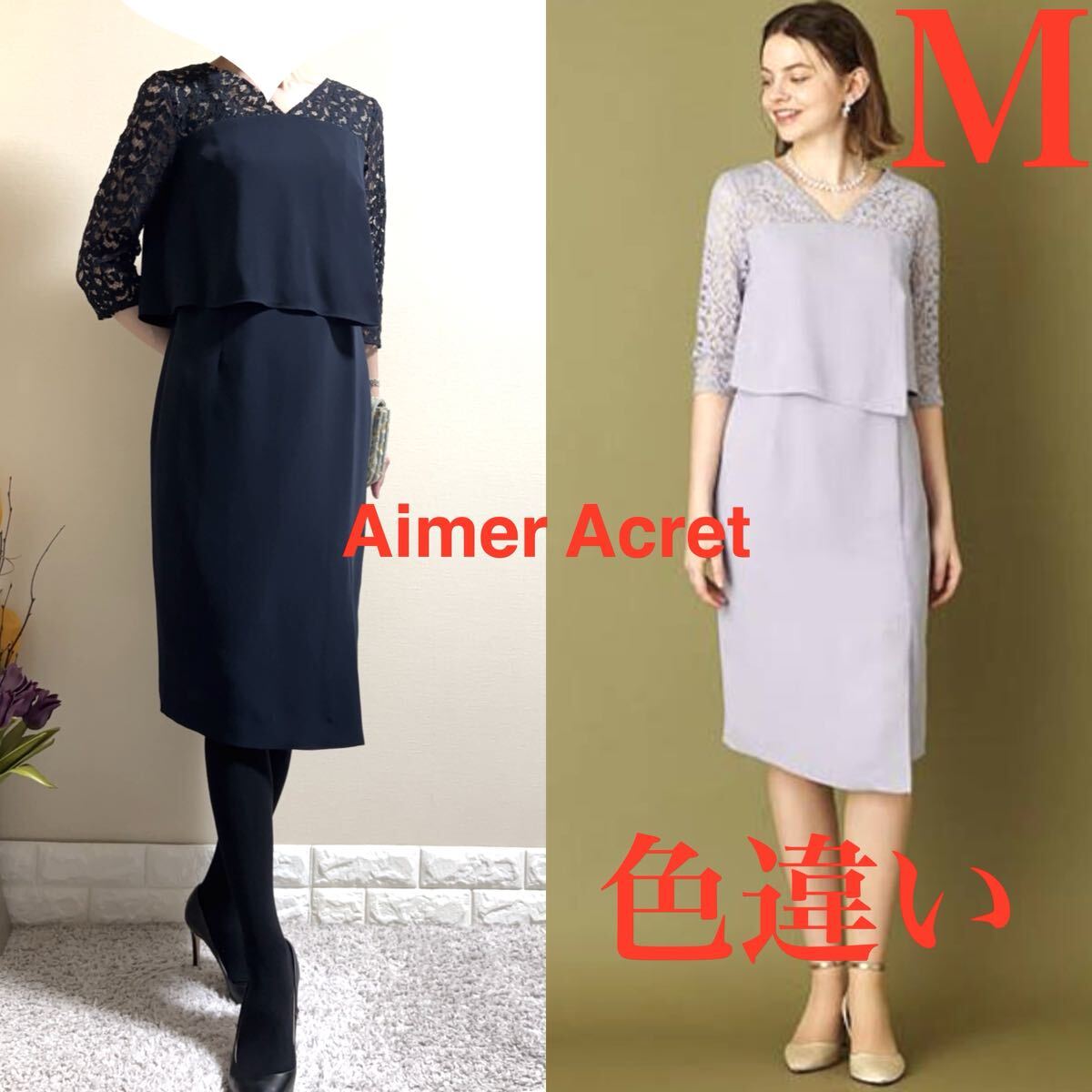 - 美品!AIMER Aimer Acret エメアクレット エメ 定価3.5万 レーススリーブ 七分袖 ワンピース 濃紺 M 通年 七五三 入学式 結婚式