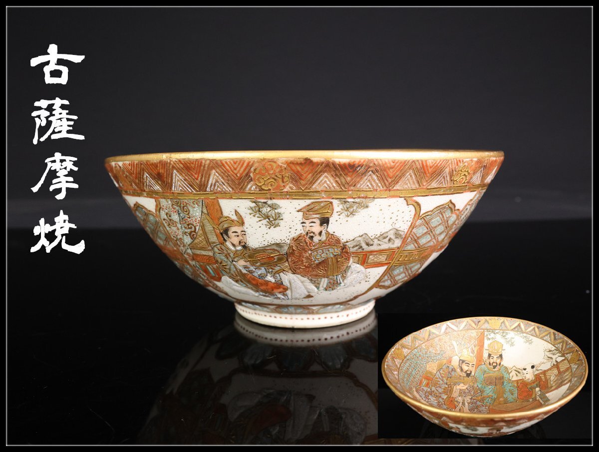 【志】D002 明治時代 【古薩摩焼】 細密金彩色絵唐人紋 茶碗 鉢 径15㎝/美品 *=拍卖