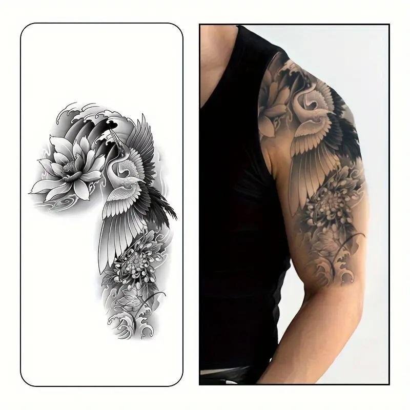 - 【送料無料!タトゥーシール】★白鶴と蓮 刺青シール 和柄 フェイクタトゥー 約 18cm×28cm 腕 肩 リアル和彫 防水・耐久性あり! (BJ-17)