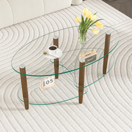 - 楕円形ガラスコーヒーテーブル 透明3段ガラス天板 オーク材脚 モダンリビングテーブル