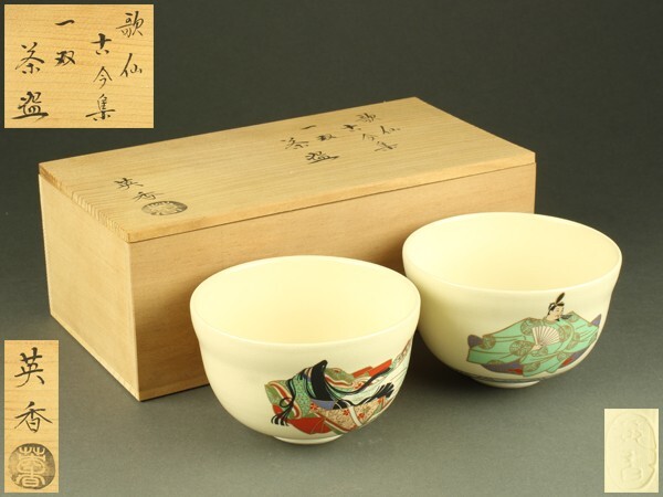 - 【宇】2085 宮地英香作 歌仙古今集 一双茶碗 共箱 茶道具