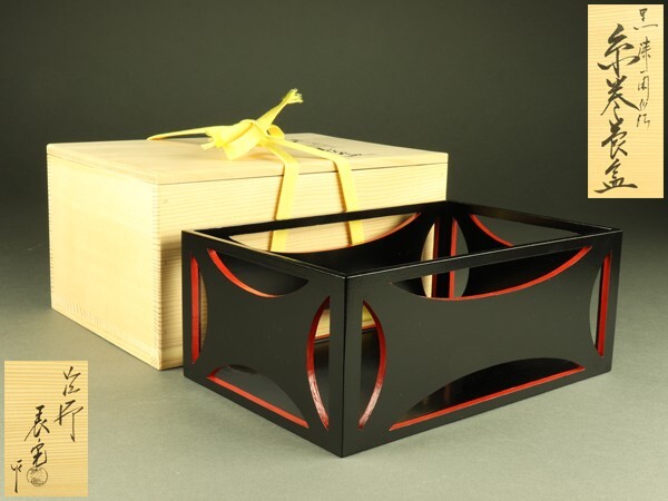 - 【宇】2910 塗師 川瀬表完作 黒漆一閑塗 糸巻莨盆 煙草盆 共箱 茶道具