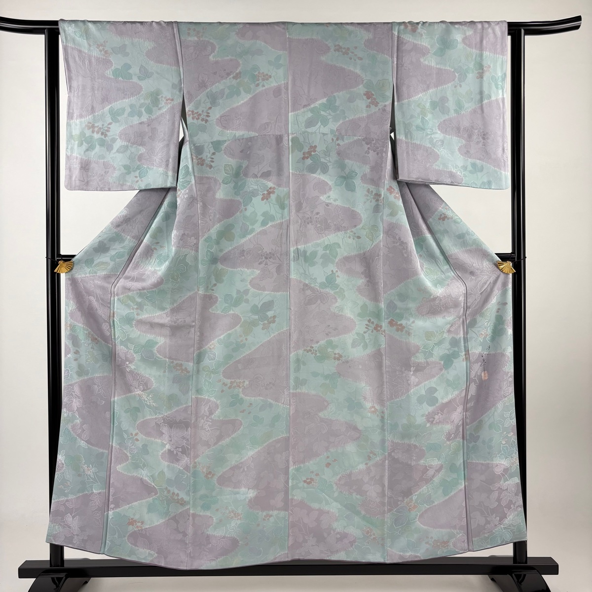 > 小紋 身丈156.5cm 裄丈63cm S 袷 落款 草花 霞 水色 正絹 美品 秀品 【中古】