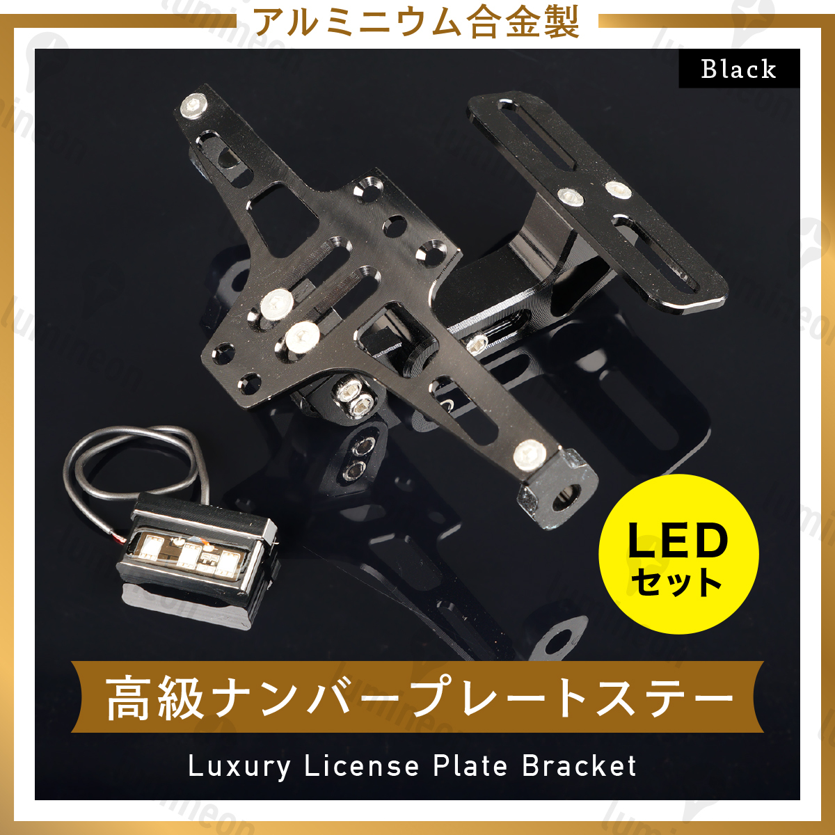 > 高級 ナンバー ステー ナンバープレート バイク LED付 ブラック 黒 折り曲げ 角度調整 上げ ナンバー かくし 隠し パタパタ 汎用 g006ba 1