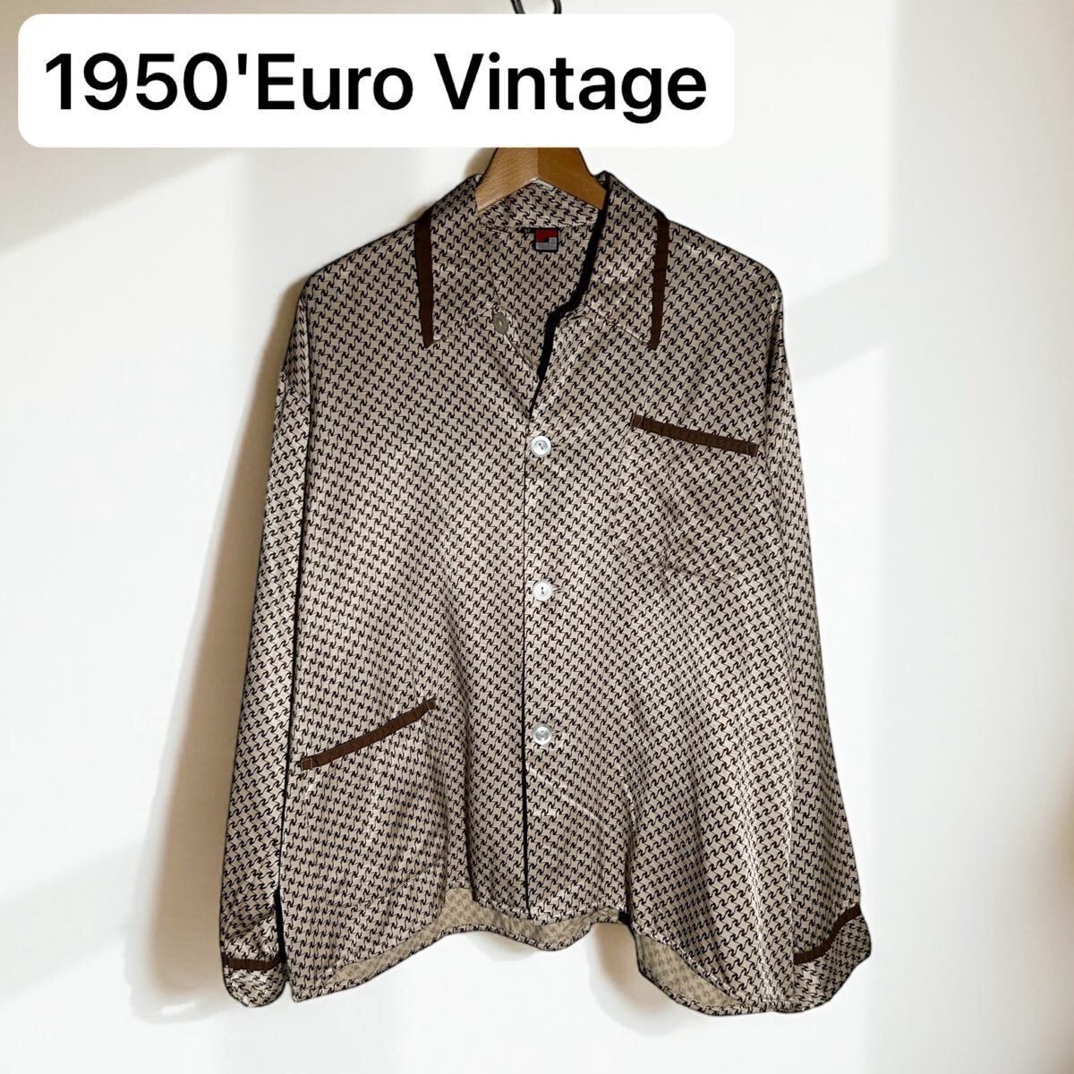 > 1950's ユーロ ヴィンテージ オープンカラー ボックスシルエット ショート サテン パジャマ シャツ 千鳥 チェック ブラウン 茶色 ポケット