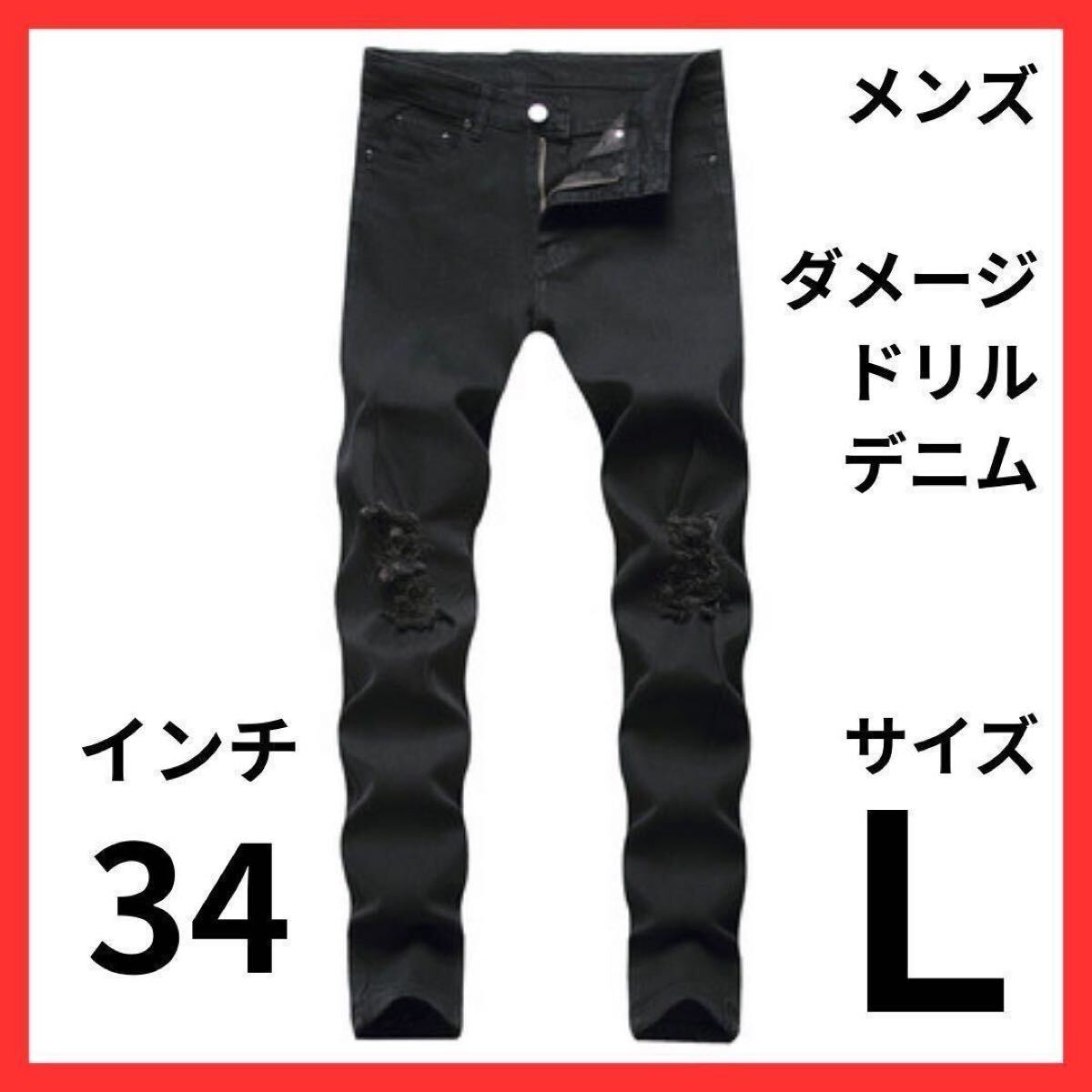 - 【大人気】L ドリルダメージジーンズ US UKBLACKデニム 定番 韓国