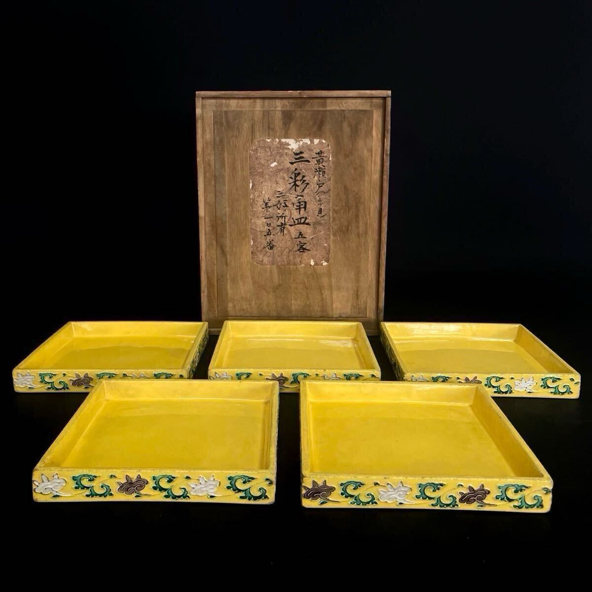 - 懐石 黄瀬戸 三彩 唐草紋 角皿 5客 共箱(1b062410 0)