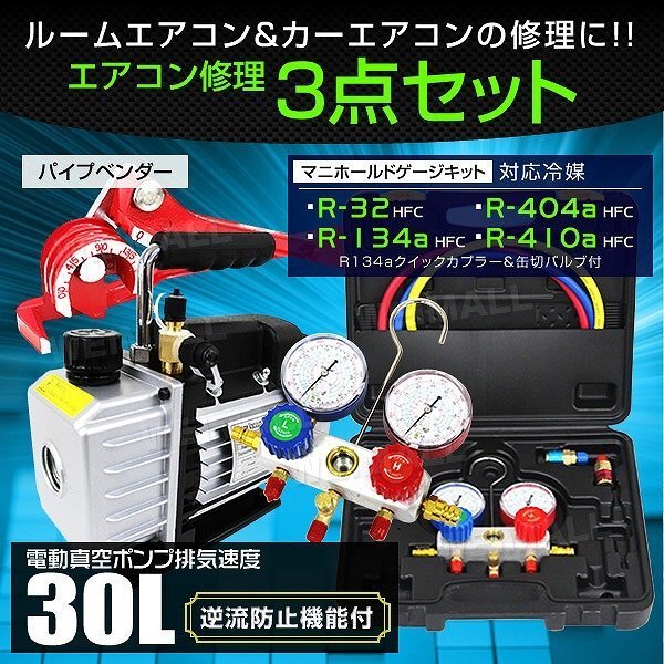 - エアコンガスチャージ 3点セット 電動真空ポンプ マニホールドゲージ パイプベンダー R134a R410A R32 R404A エアコン ガス補充 業者 修繕