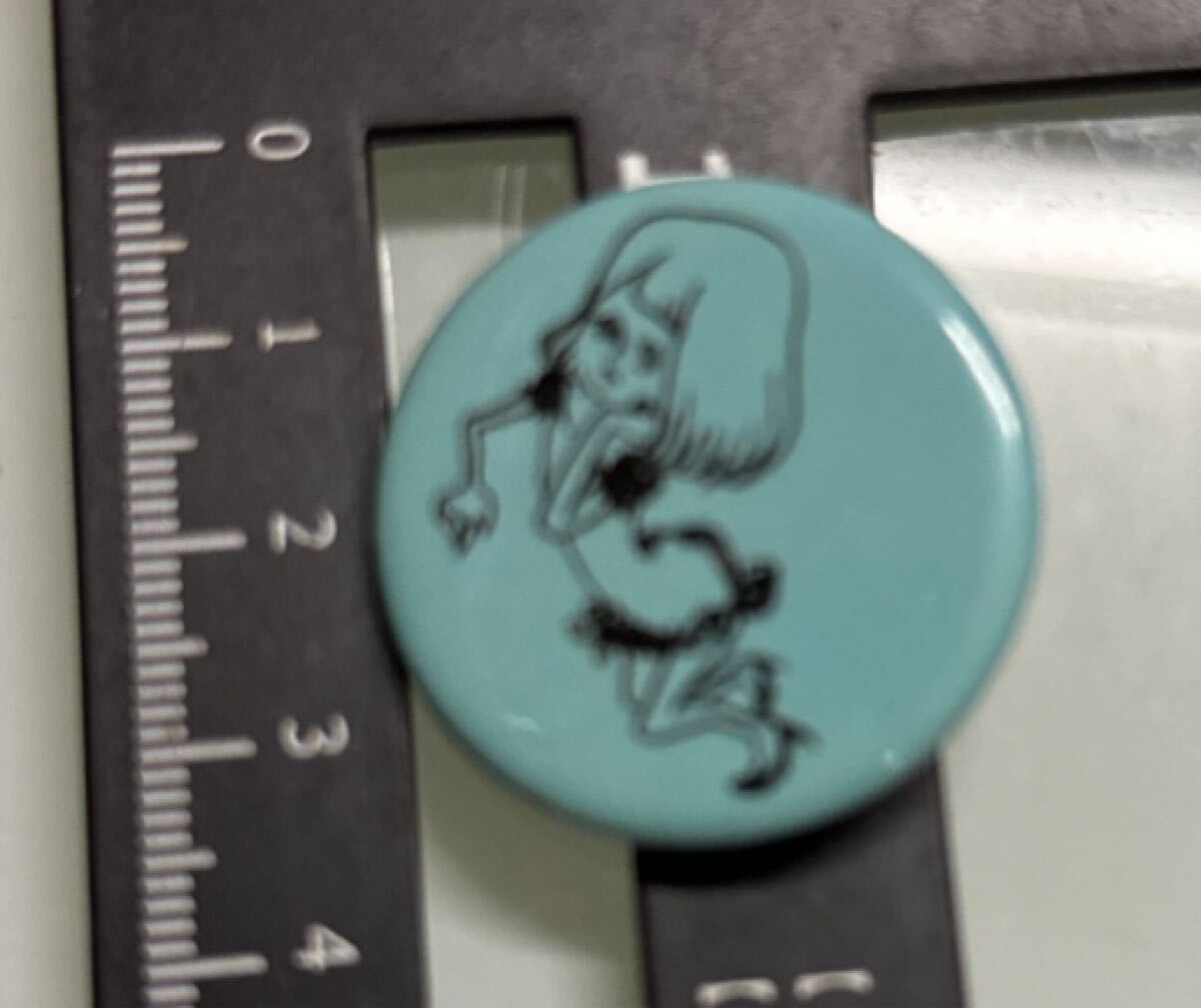 - 水色の丸い缶バッジで、黒い線で描かれた女性のイラストが特徴