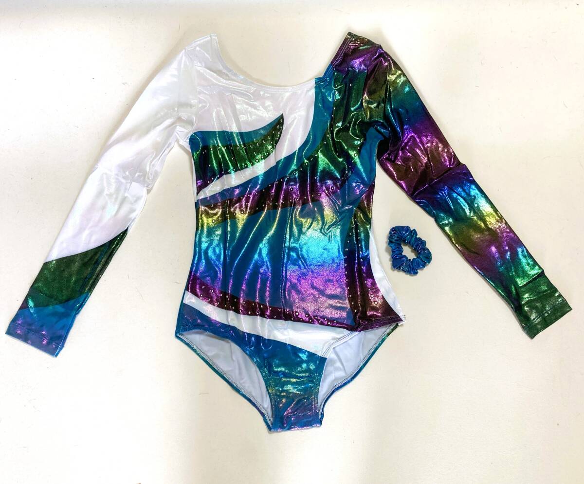 > 新作/US14サイズ/Poly Unicorn ダークブルー白黒ロングスリーブ 長袖レオタードシュシュ付 ツルスベ メタリック キラキラ ラインストーン