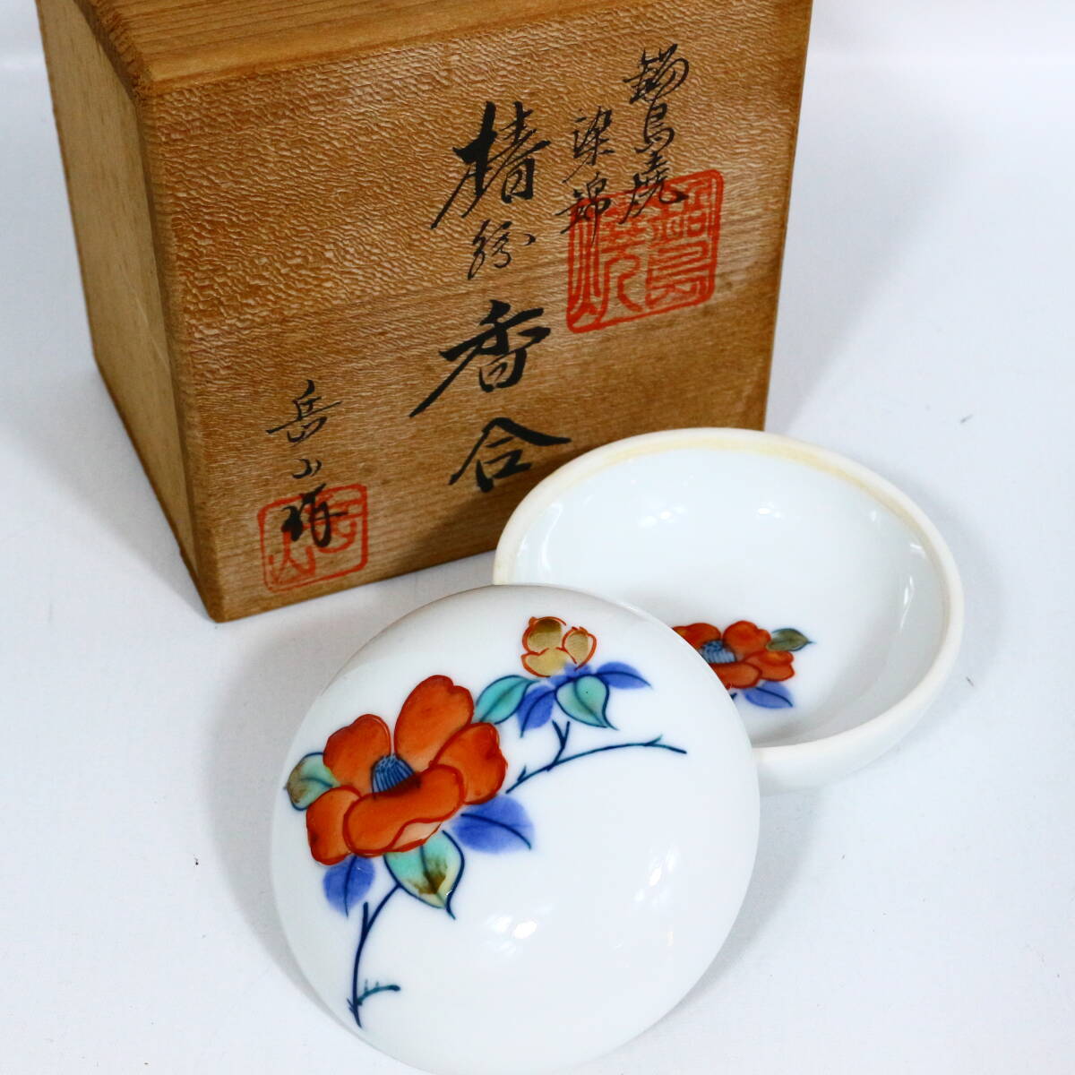- 柴田岳山 鍋島焼 染錦 花唐草文 香合 共箱 茶道具