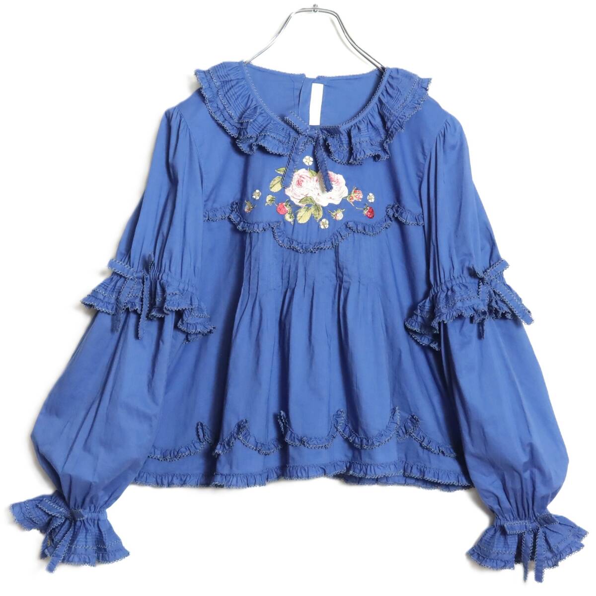 > 【極美品】ピンクハウス★2023秋カタログ掲載!ベリーローズ刺ブラウス 紺系 お袖2way♪残布有 z15434
