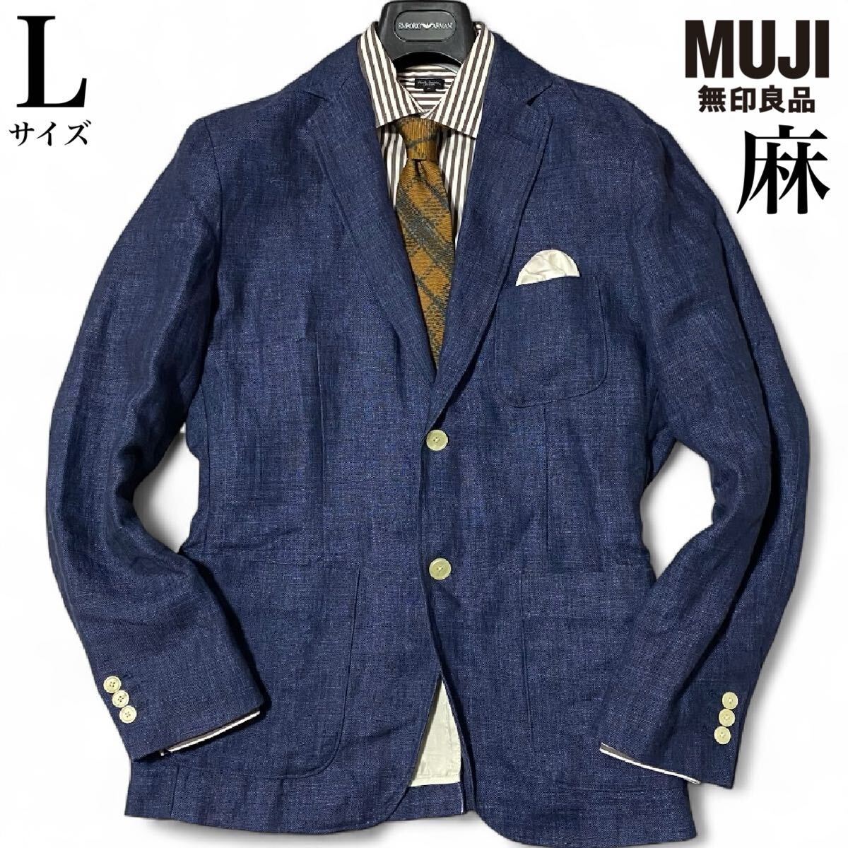 > 希少L◎麻/リネン100%【無印良品】MUJI テーラードジャケット 大きめサイズ 鮮やかなネイビーブルー 水牛釦×アンコン×本切羽 秋◎