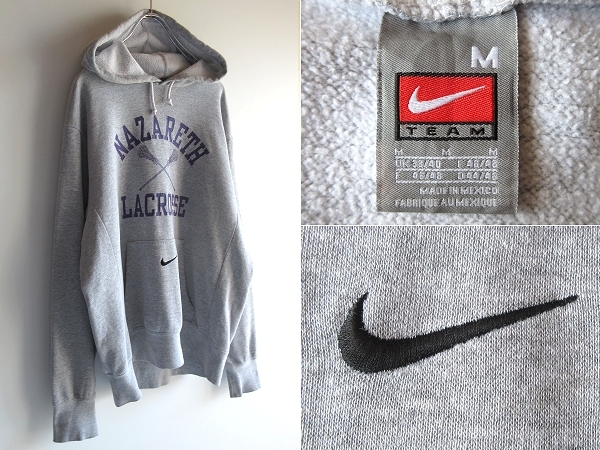 > 希少 90sビンテージ NIKE ナイキ センターロゴ スウォッシュロゴ刺繍 MAZARETH LACROSSE ラクロス プリント スウェットパーカー M グレー