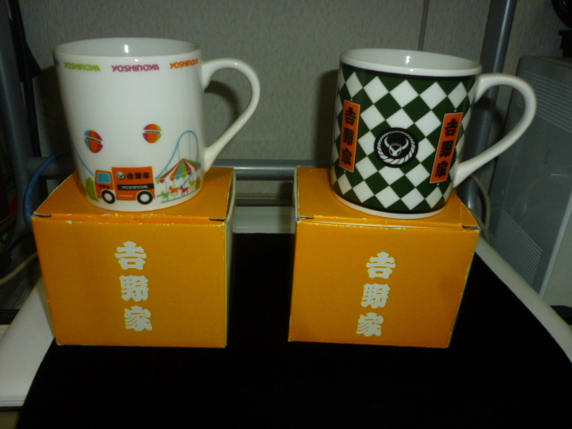 - 未使用 非売品 吉野家 陶器製マグカップ 2種セット 遊園地柄・格子柄