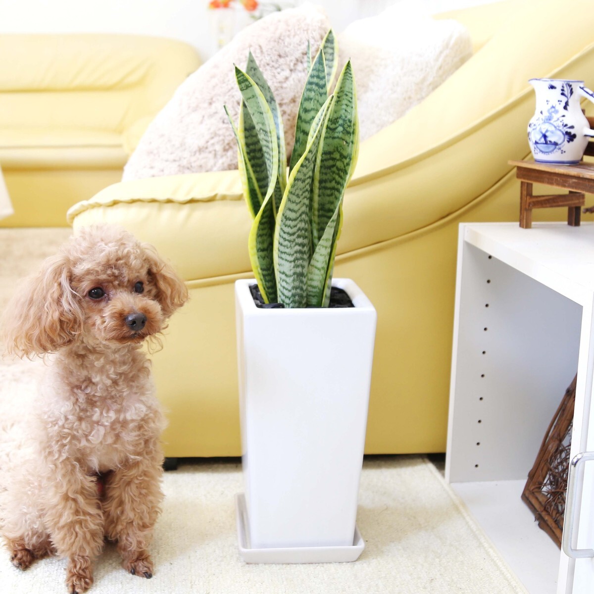 - 空気を浄化するといわれているサンスベリアのホワイト陶器鉢 6号「ストレート」 土の表面:竹炭タイプ|観葉植物 多肉植物