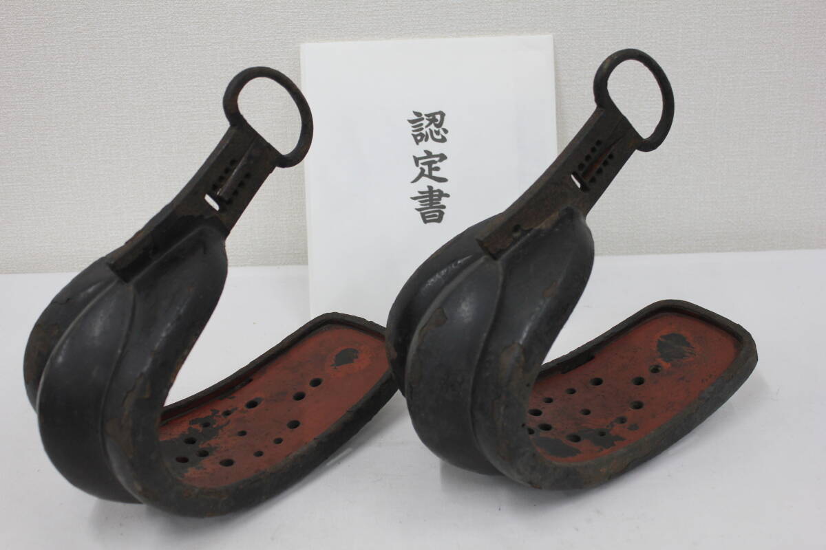 - 【認定書付き】 黒漆塗水馬用双笑鉄鐙 馬具 武具 鐙 骨董 古美術 時代物 江戸時代中期 あぶみ BT1180