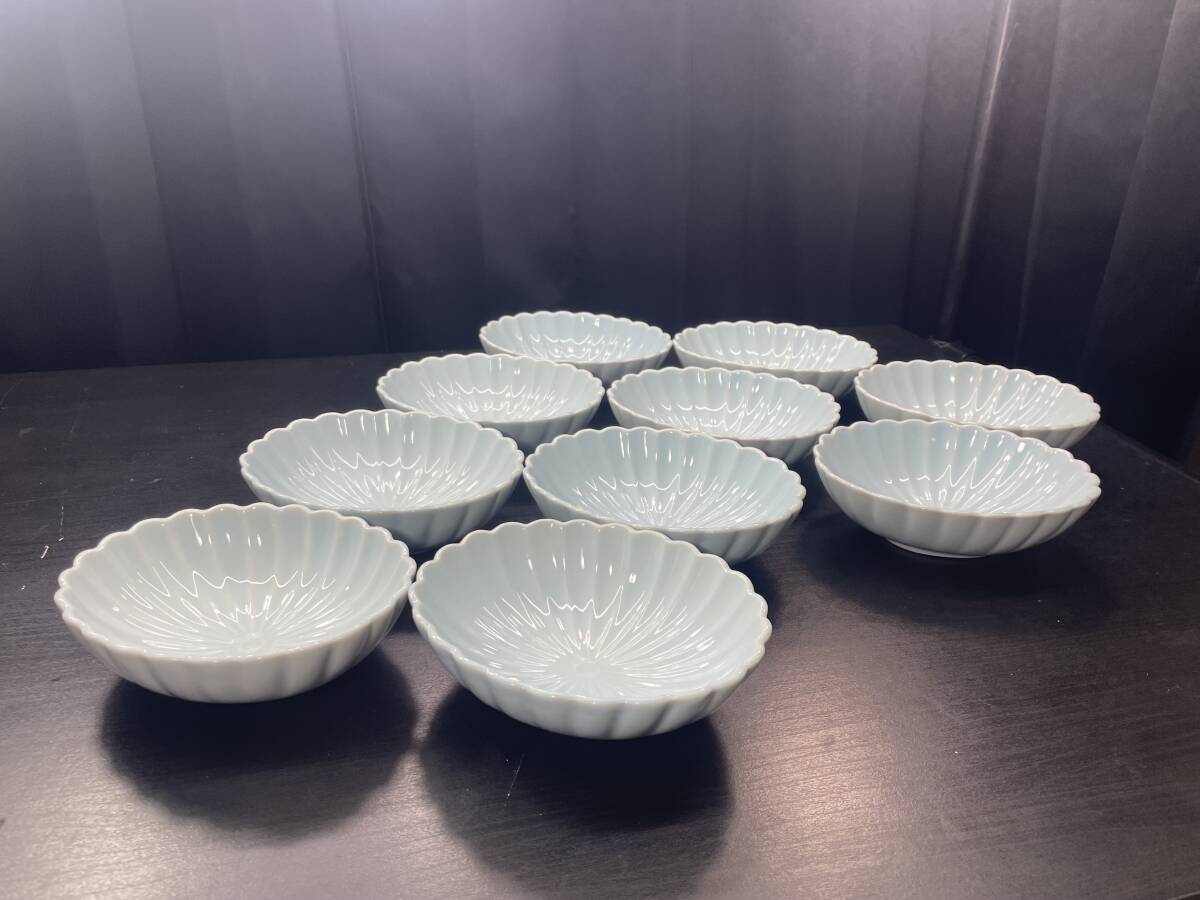 - 割烹料亭柄引き上げ 有田焼 青磁 菊小判型 向付 お造り 先付け 水菓子に! 10枚セット 福岡県 NO1