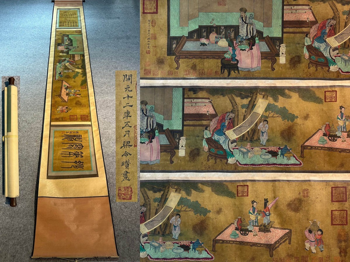 - 中国書画「唐 梁令サン 人物図長巻」肉筆絹本 掛け軸 墨寶妙品 書画横軸 巻き物 古美術 旧蔵出