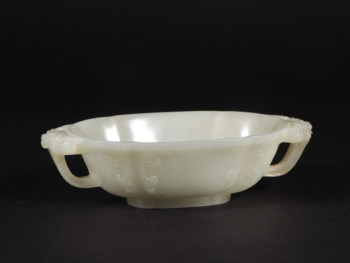 - 「清時代 和田玉 白玉彫り 耳杯」極細工 擺件 中国古賞物 古美術 旧蔵出