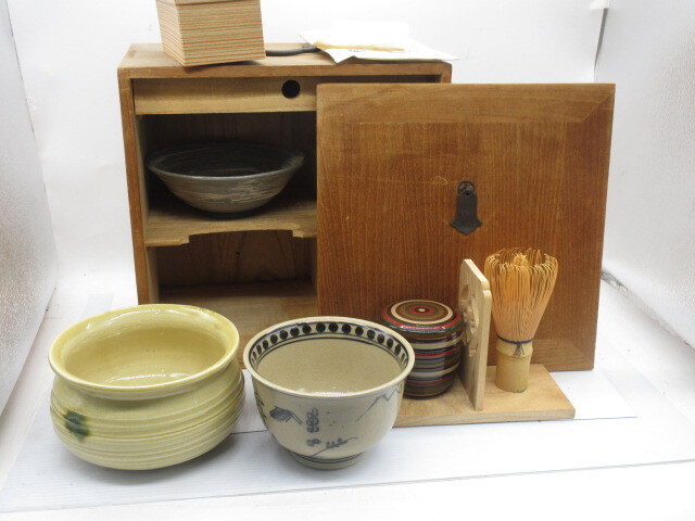 - 京焼 茶道具【茶箱セット 短冊箱 旅箪笥 茶碗/建水/茶入/茶筅他 桐箱入】27x28x18.5㎝