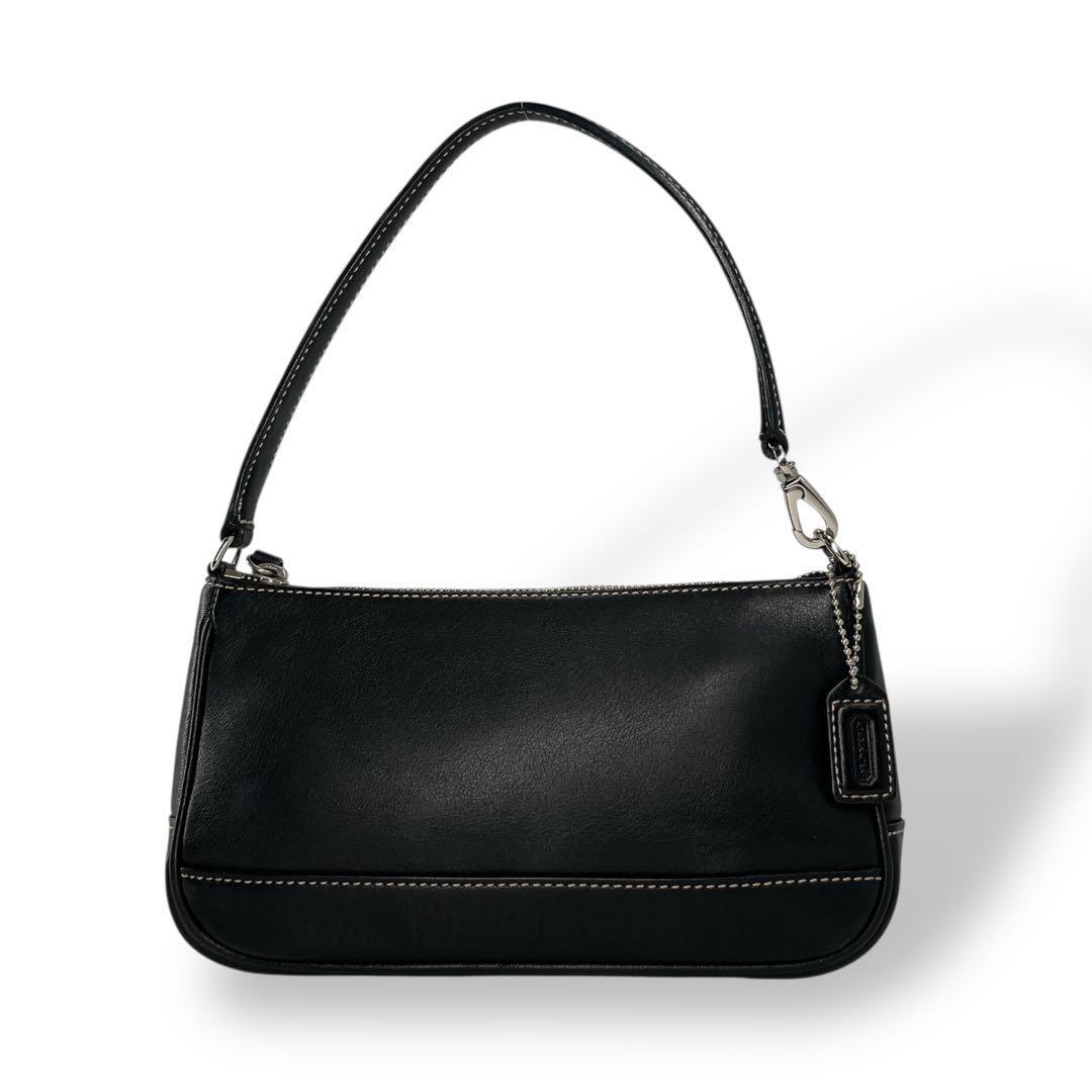 - 美品 OLD COACH オールドコーチ アクセサリーポーチ ミニハンドバッグ 革ロゴ レザー 黒 ロゴ刻印 シルバー金具 ブラック