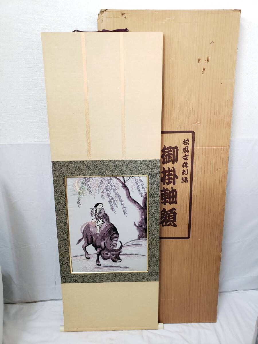 > 【うぶだし】松鳩文化刺繍 十牛図 騎牛帰家 御掛軸額/掛け軸/掛物/床掛け/茶道具/室内装飾/禅画/牧童/牛/床の間飾り/約137×47cm/22-RMK56