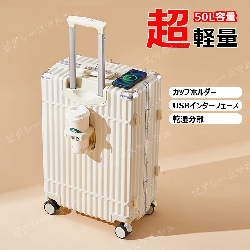 > 22インチの超軽量スーツケース、カップホルダー+USBインターフェース+乾湿分離、アルミフレームトロリースーツケース ムおしゃれかわいい