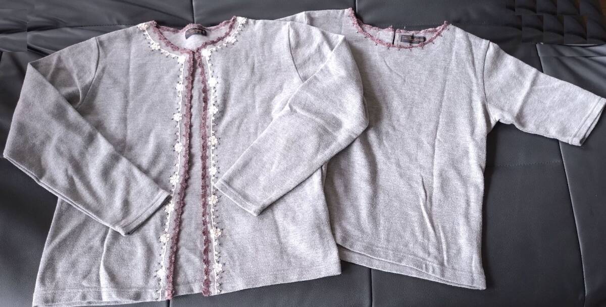 - ★ お上品 刺繍 縁取り 素敵 アンサンブル ツイン カットソー カーディガン 半袖 M グレー ★