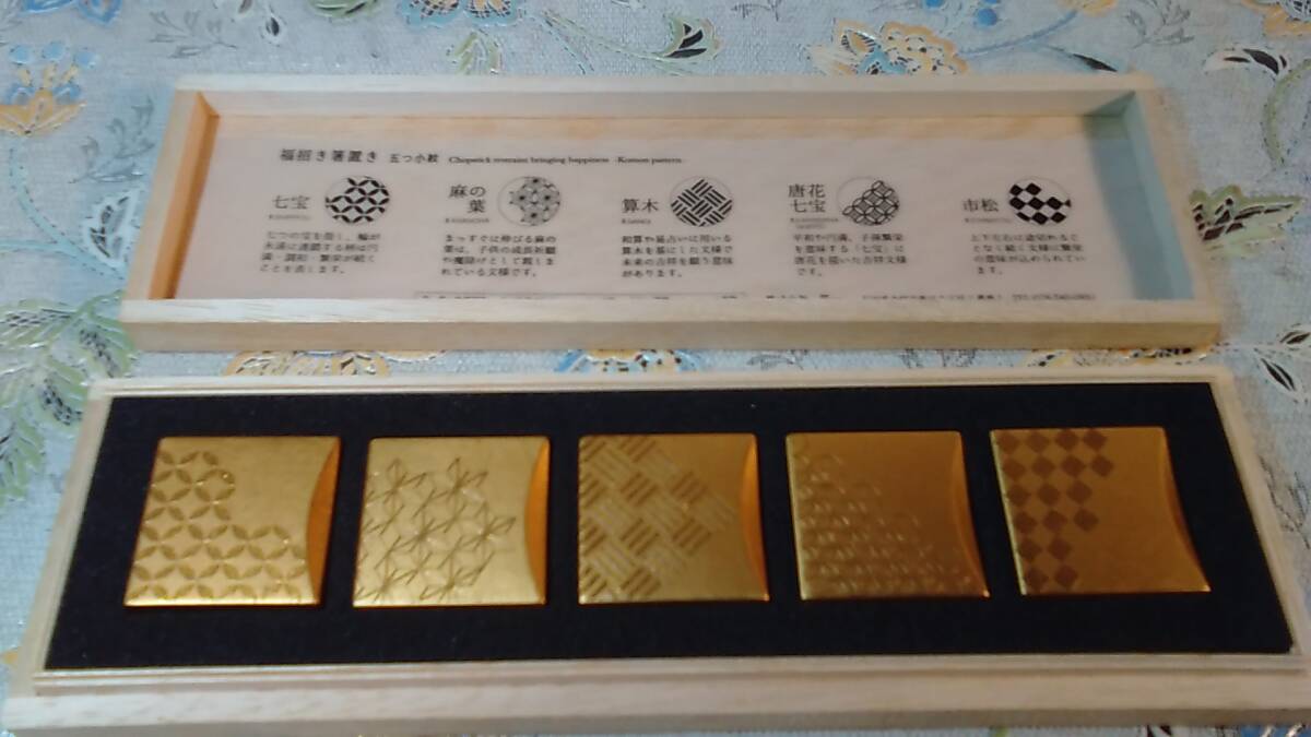 - ■■ 箔一 金箔 福招き 箸置き 五つ小紋 木箱入り 未使用保管品■■