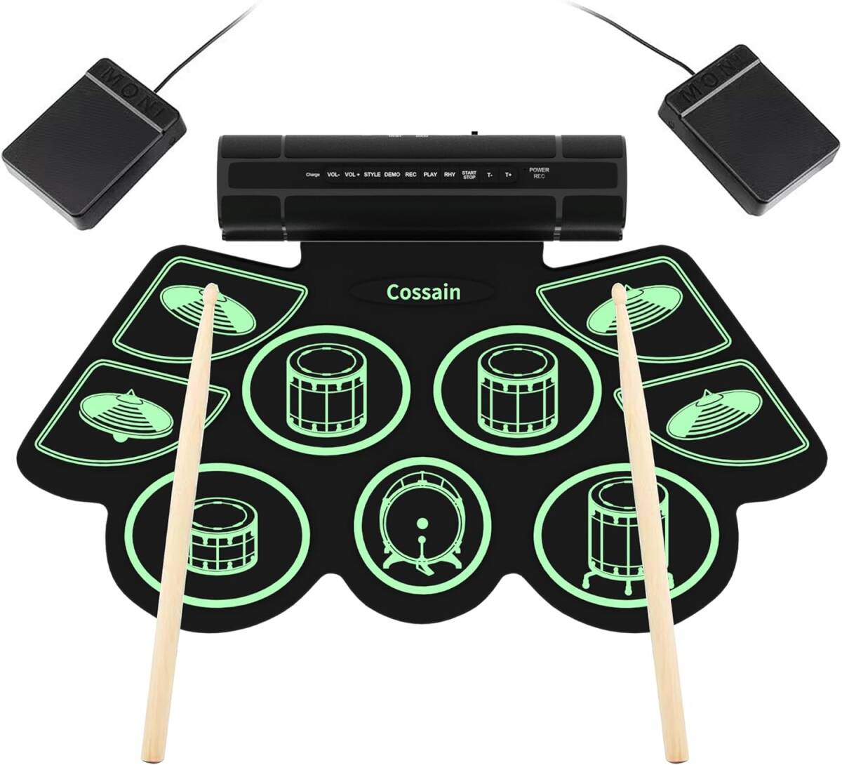 - グリーン色 電子ドラム 折りたたみ 小さく畳める ロール 子供向け 初心者向け セット 持ち運び 9パッド ハイハット付き