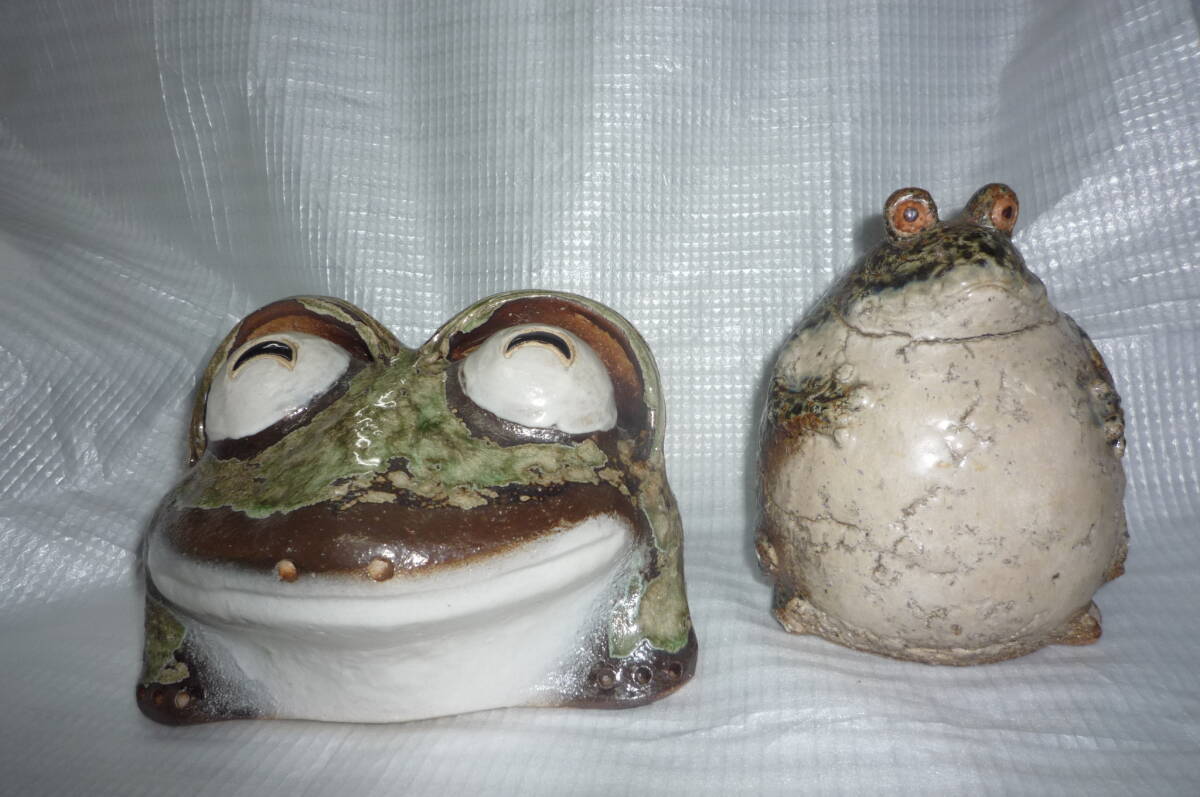 - カエルの置物2体 陶器製/焼物 /信楽焼か備前焼/一部欠け有りグリーン系 大きさ目の大きいほうで横20奥行21高さ15㎝