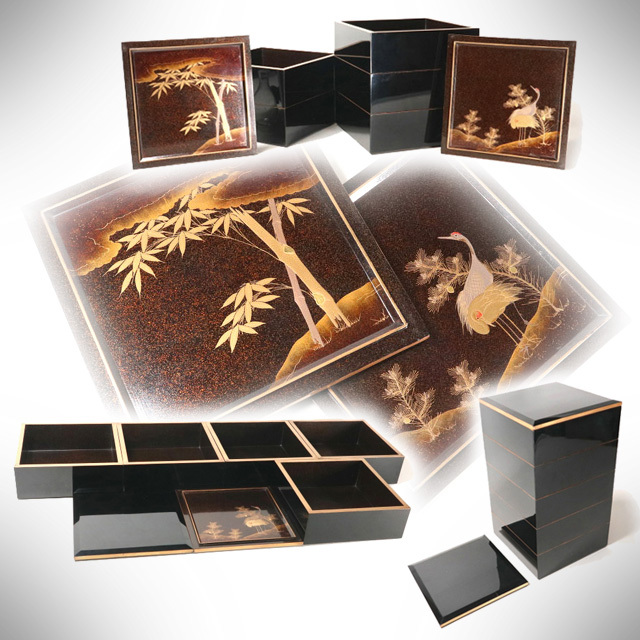 二枚の蓋見返りには絵変りで一枚は鶴松、もう一枚は雲竹の高蒔絵を施した五段重箱となります。
