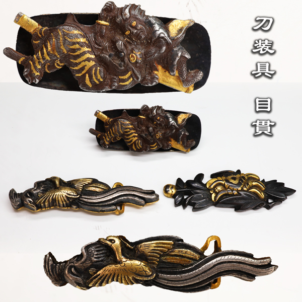 > ◇雅◇ 時代武具 刀装具 目貫 3点まとめ 金象嵌色絵 赤銅地目貫 虎に人図 鳳凰図 蟹図 日本刀装具金具 /OD.25.5 [J72] OQ
