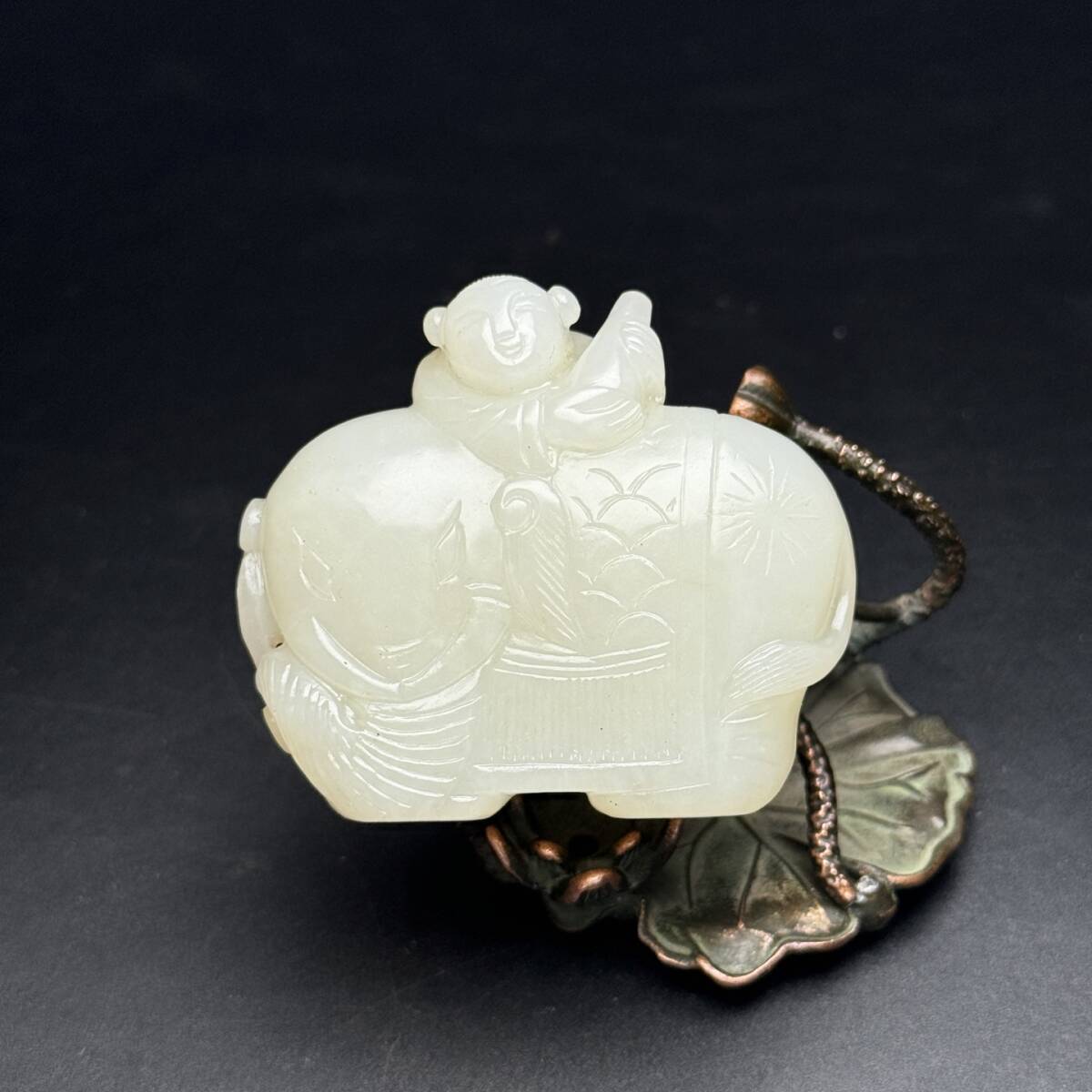 - 『館蔵珍品 和田玉製 細密彫 童子大象 置物 賞物』文房具 書道品 貴重物品 収蔵品 中国古美術 時代物 古董品