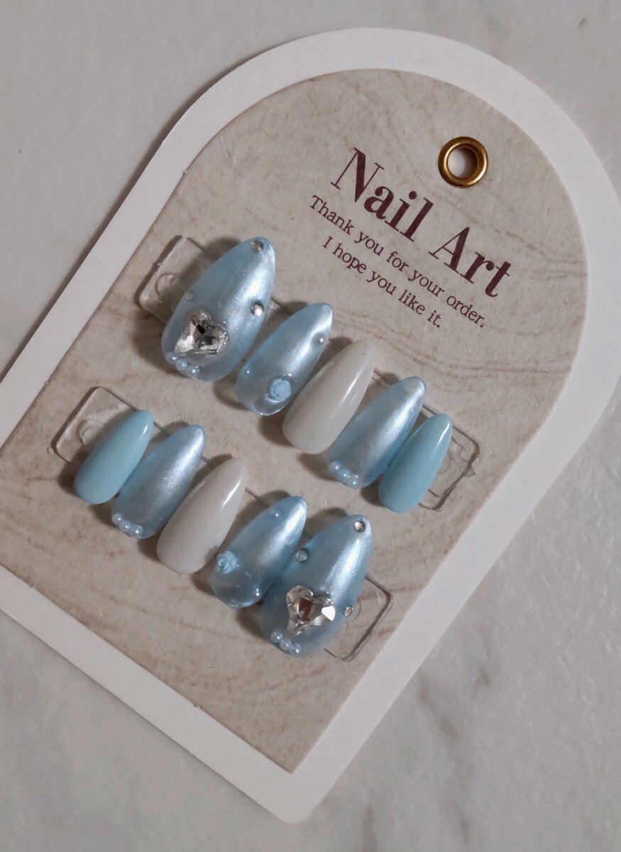 - ブルーハートネイルチップ#ネイルチップ#ガーリー #スナ系 #韓国#マグネット#ワンホン#キラキラ