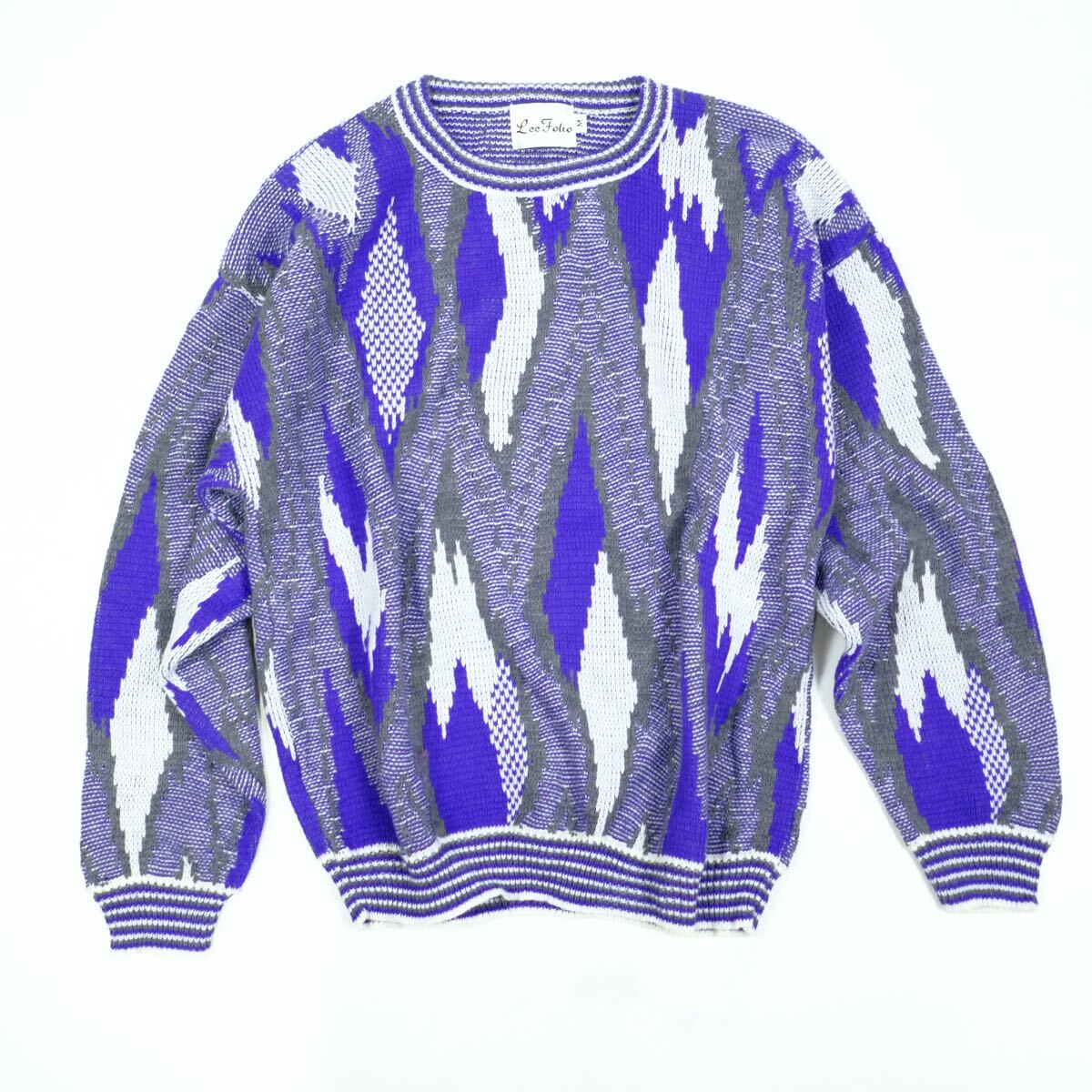 > 1980s ユーロビンテージ 総柄ニットセーター 幾何学模様 オーバーサイズ フランス 古着屋 アート レア 紫 パープル FICCE