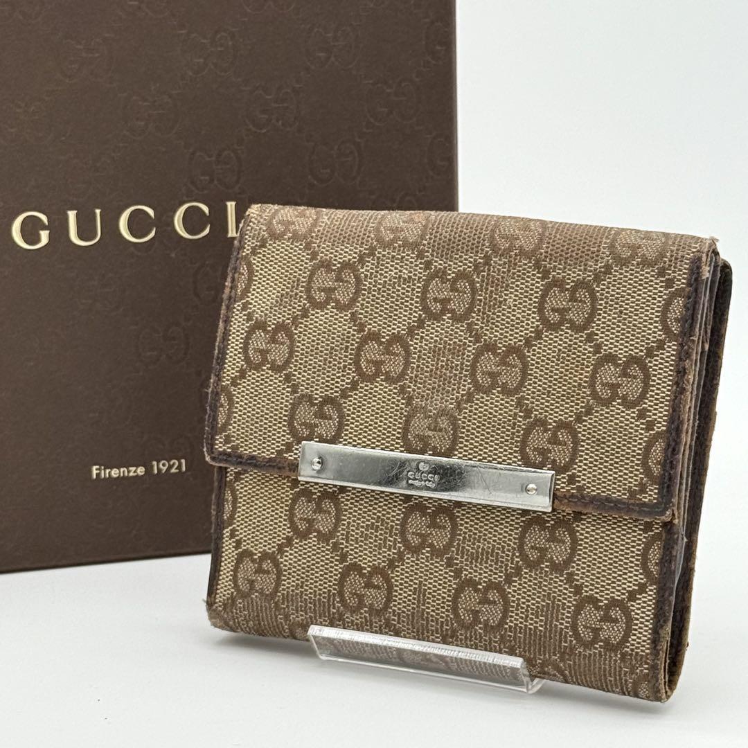 > 【良品】GUCCI グッチ 三つ折り財布 GG柄 ミニ財布 ヴィンテージ フォーマル レザー キャンバス メンズ レディース ブラウン BJ810421T