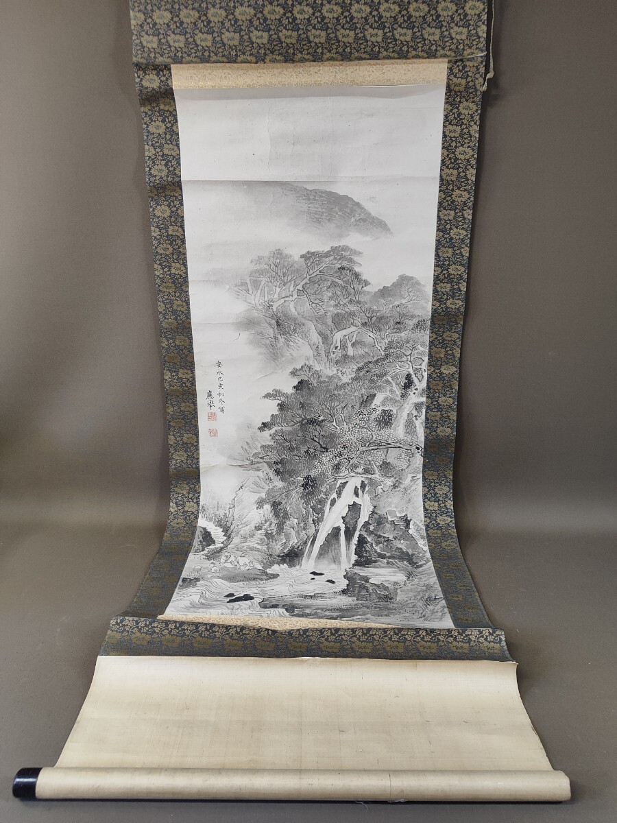 - k129 【円山応挙】山水図 水墨画 安永 江戸時代 箱無 掛軸 紙本 模写