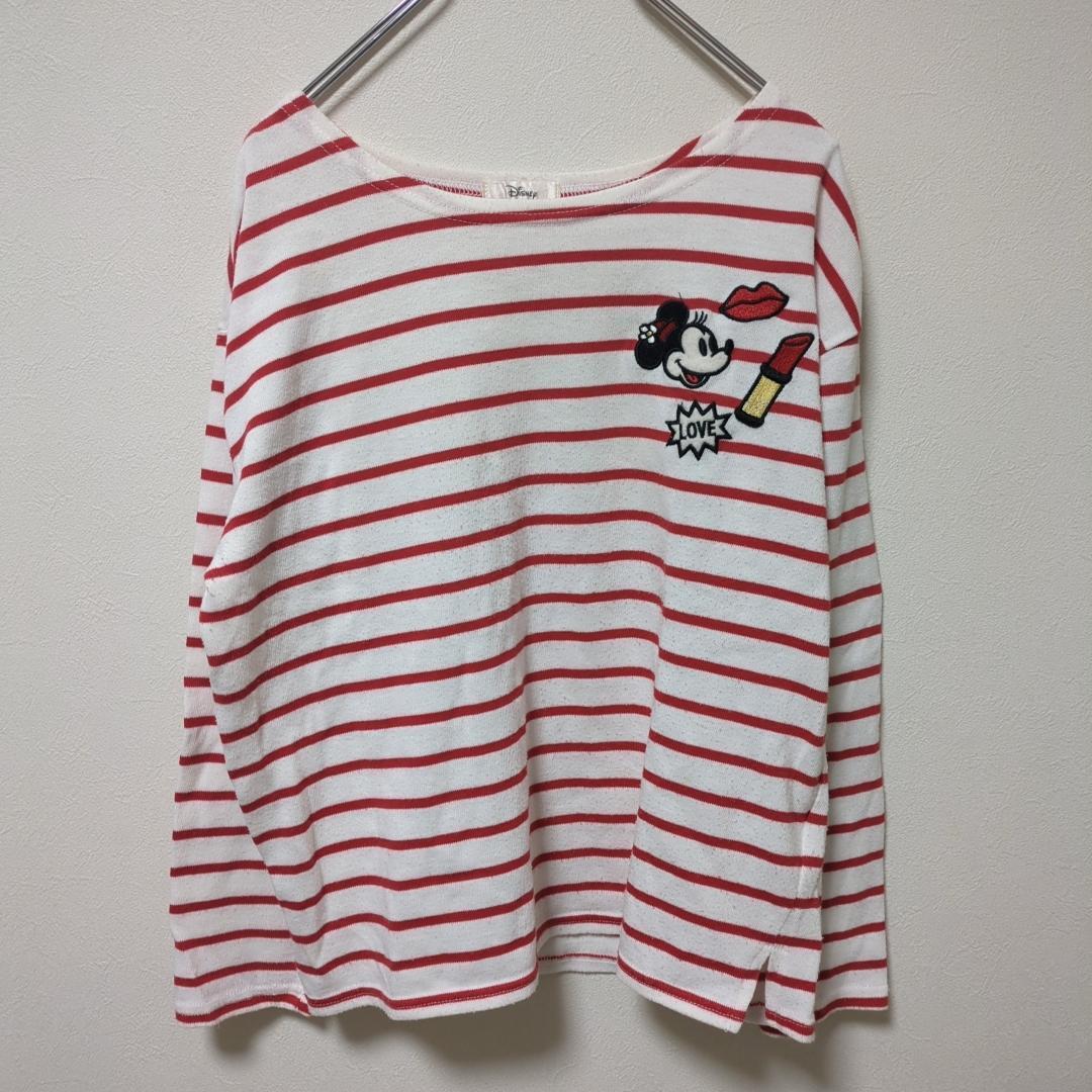 - ディズニー(M)ボーダーカットソー*ミニー*長袖*刺繍*レディース*ロT*赤白