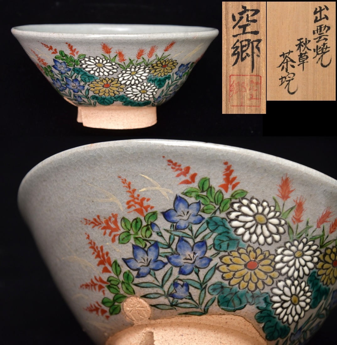 - 108 出雲焼 長岡空郷 秋草茶碗 楽山焼● 茶道具 共箱 島根県 松江 陶芸家 不昧公 現代作家 伝統工芸 茶室 茶事