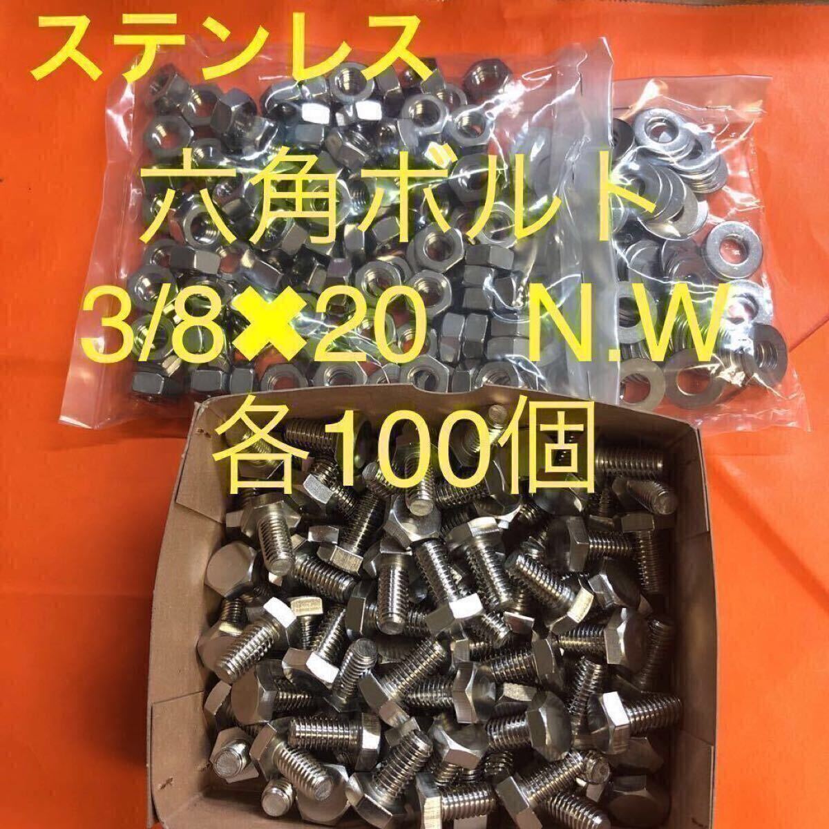 - ★送料無★ステンレス 六角ボルト 3/8×20 ナット・平ワッシャー 各100個 ステン六角ボルト
