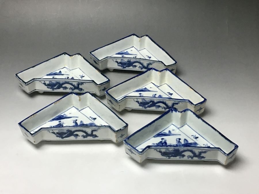- ■個人コレクション出品■作者不詳 古染付風向付五客 共箱 食器 料亭 懐石 染付の絶妙なバランス!! 料理人必見!!