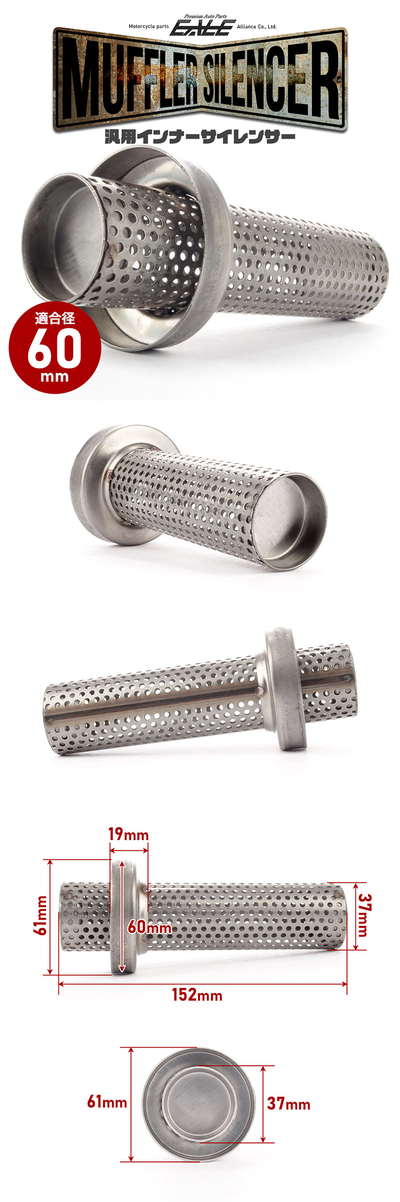 > バイク 汎用 適合径60mm ロング パンチングメッシュ マフラー インナーサイレンサー バッフル 消音器 ステンレス 排気音抑制 S-1009
