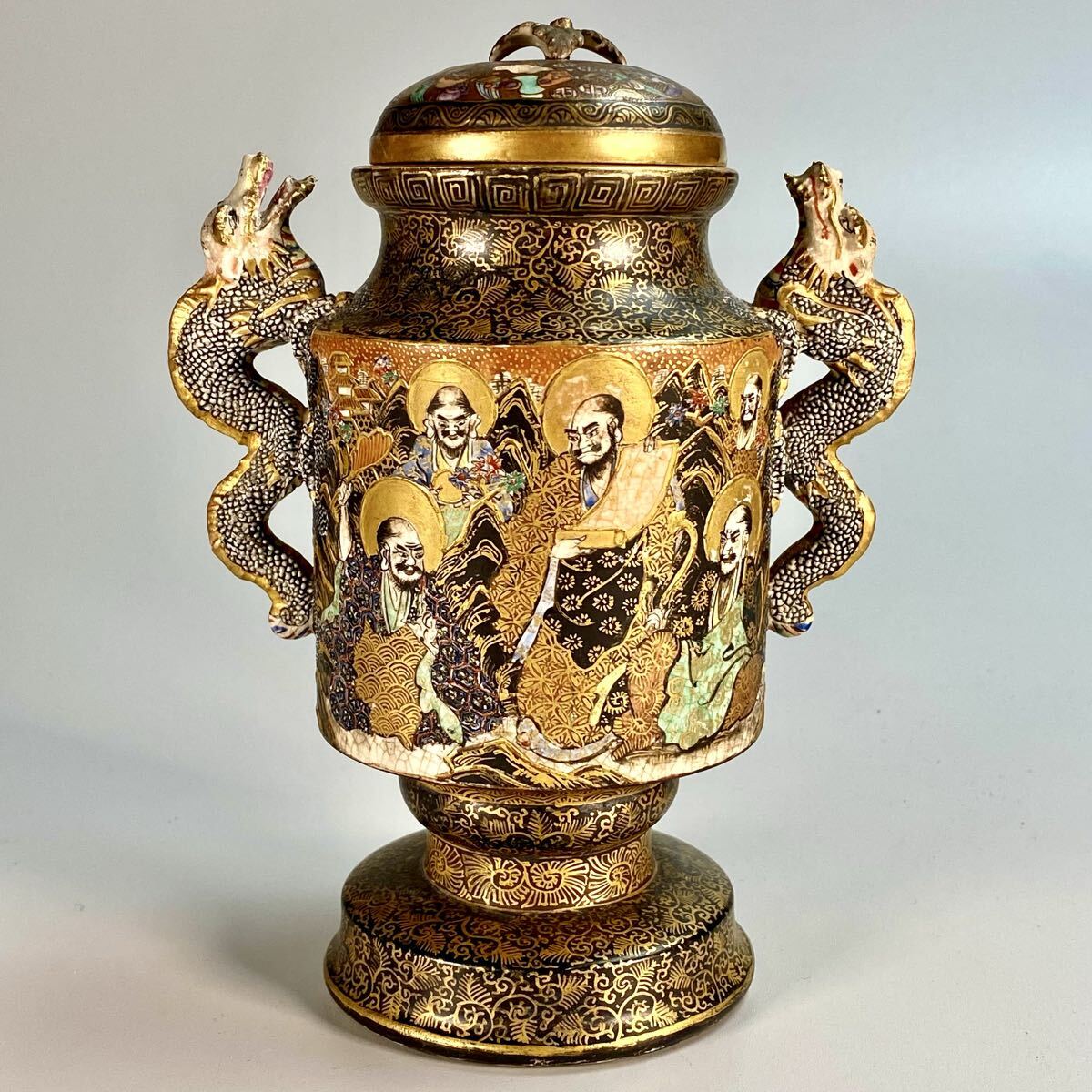 - ◆ 薩摩焼 錦谷 恒信作 龍彫刻金彩羅漢図香炉 17cm 唐物 骨董 [J7.1]きの2