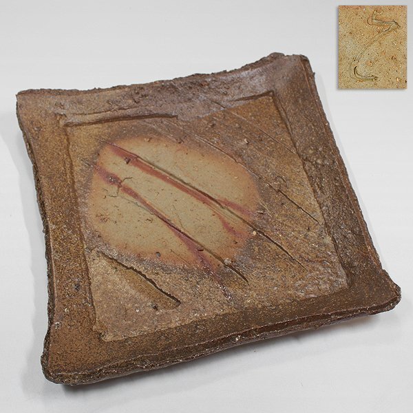 - 【TAKIYA】7968 陶芸家 隠崎隆一『 備前角皿 ②』 銘有 共箱 師: 人間国宝 伊勢崎淳