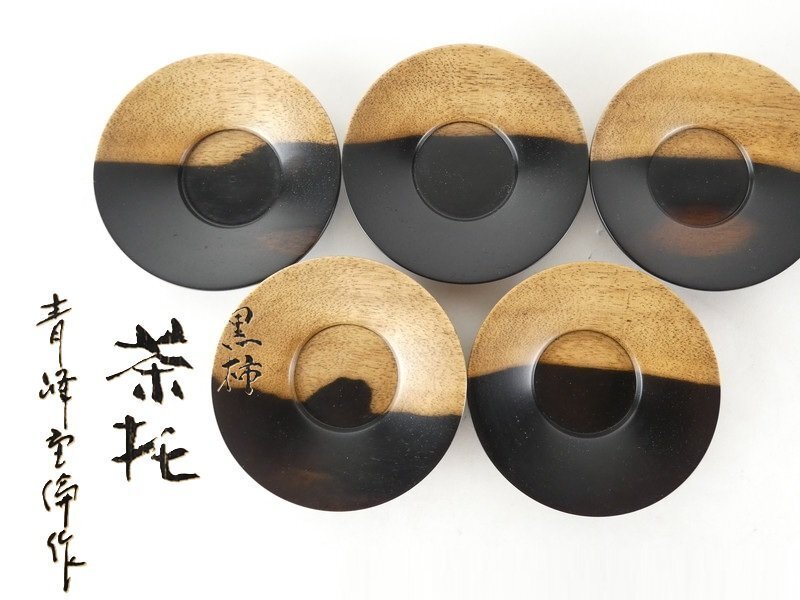 > 【扇屋】青峰重倫 作「黒柿 茶托」5客 共箱 幅 約9cm 高さ 約1.5cm 湯呑 茶碗 汲出 急須 茶器 茶道具 漆器 漆芸 受け皿 木製 D-1 saku