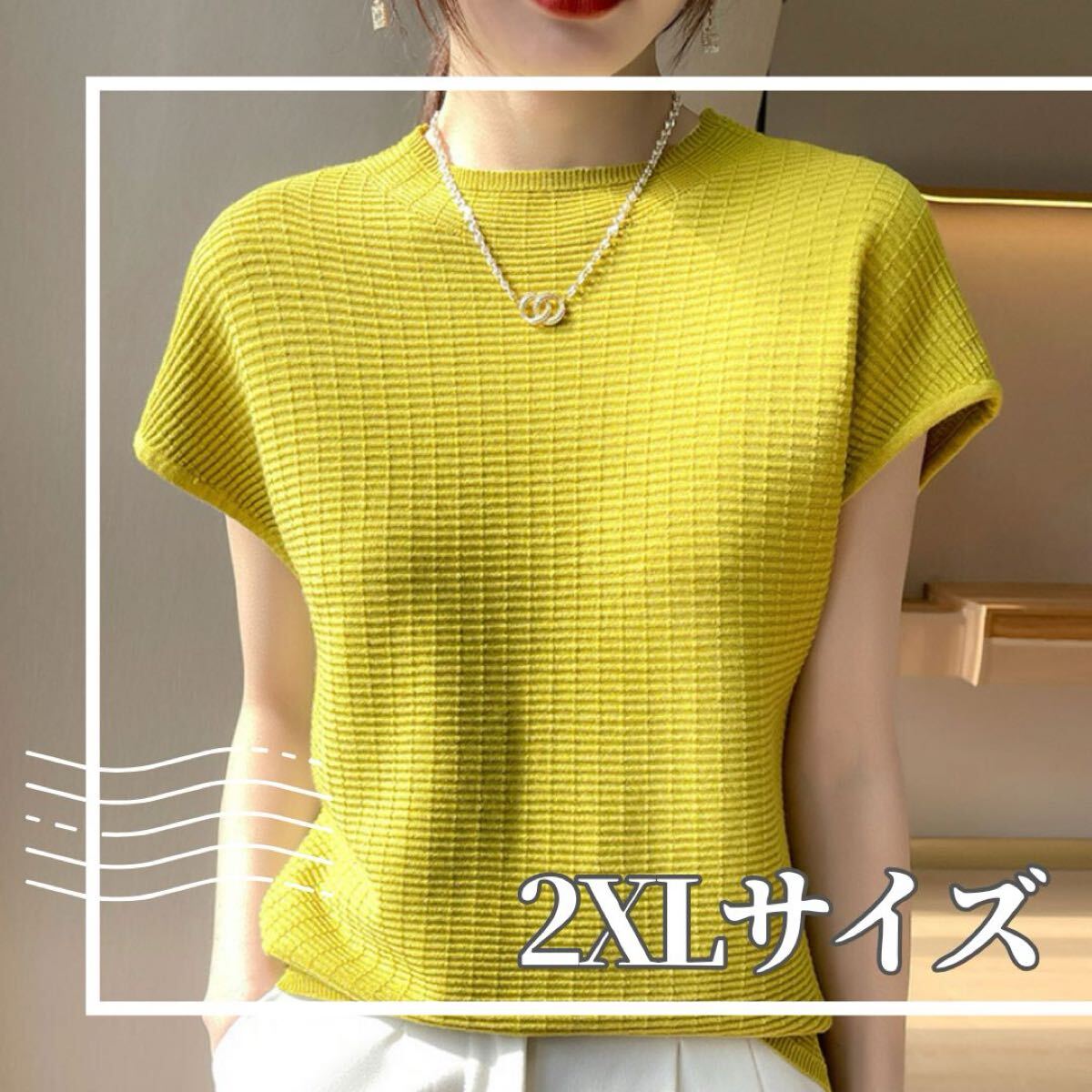 - 【2XL】サマーニット フレンチスリーブ 半袖 モックネックトップス イエロー